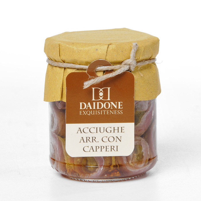 Ančovičky rolované s kapary v olivovém oleji. Ideální pro antipasto nebo jako dárek.