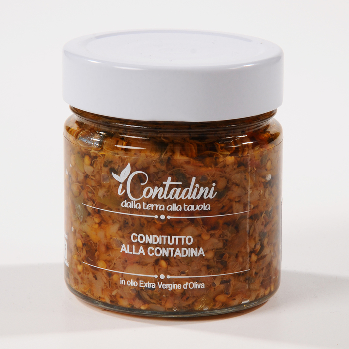 Složení: sušená zelenina (lilek, cuketa, rajčata, cibule) 55%, olivový olej extra vergine 25%, olivy, kapary, jablečný ocet, bylinky, sůl, citronová šťáva.