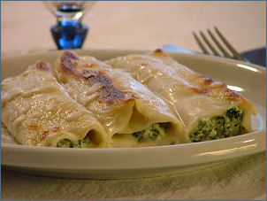 Špenát spaříme, přidáme bazalku a nasekáme na jemno. Promícháme s ricottou a žloutkem. Směs osolíme, opepříme. Přidáme muškátový oříšek a parmazán. Cannelloni naplníme hotovou směsí a klademe do máslem vymazané zapékací mísy.Zalijeme bešamelem, posypeme sýrem a poklademe máslem.