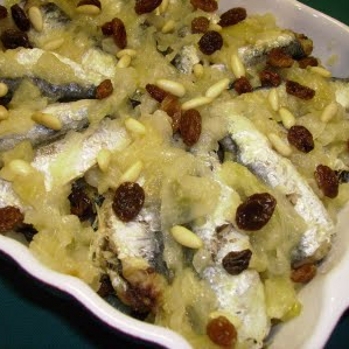 Rozinky namočte do bílého vína. Cibule rozkrojte na poloviny a ty na jemné půlměsíčky. Přidejte bobkový list a celý pepř. Dejte do pánve se dvěma lžícemi oleje na mírný plamen.V okažiku, kdy je cibule téměř průsvitná, ale ještě nezačíná zlánout (cca 7 minut), přidejte rozinky a piniové oříšky. Zalijte vinným octem a duste, až je cibule měkká.